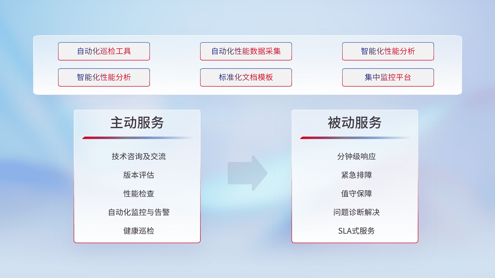 智能化工具和标准化文档,,,,保障服务质量,,,,提供主动服务(包含技术咨询、、、版本评估、、、、性能检查、、、自动化监控与告警、、、健康巡检)和被动服务包含(分钟级响应、、、、紧急排障、、、值守保障、、问题诊断解决、、、、SLA服务)。。。。