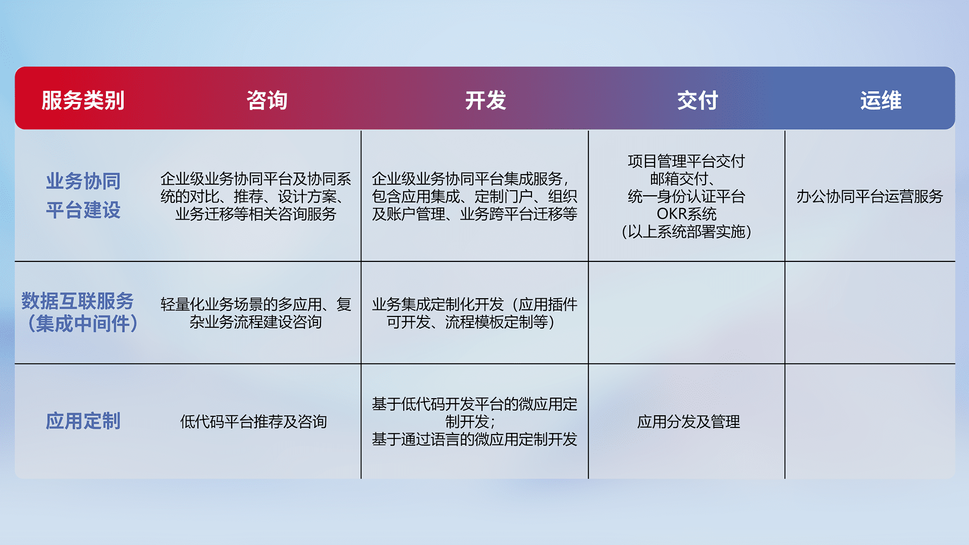 针对钉钉、、企微、、、IDaas等平台级产品提供产品的规划、、、方案、、交付、、、定制化开发等服务,,实现如统一协同办公、、、、智能客户服务、、、、混合会议管理、、智能数据查询、、等业务场景,,,实现数字化转型。。。。